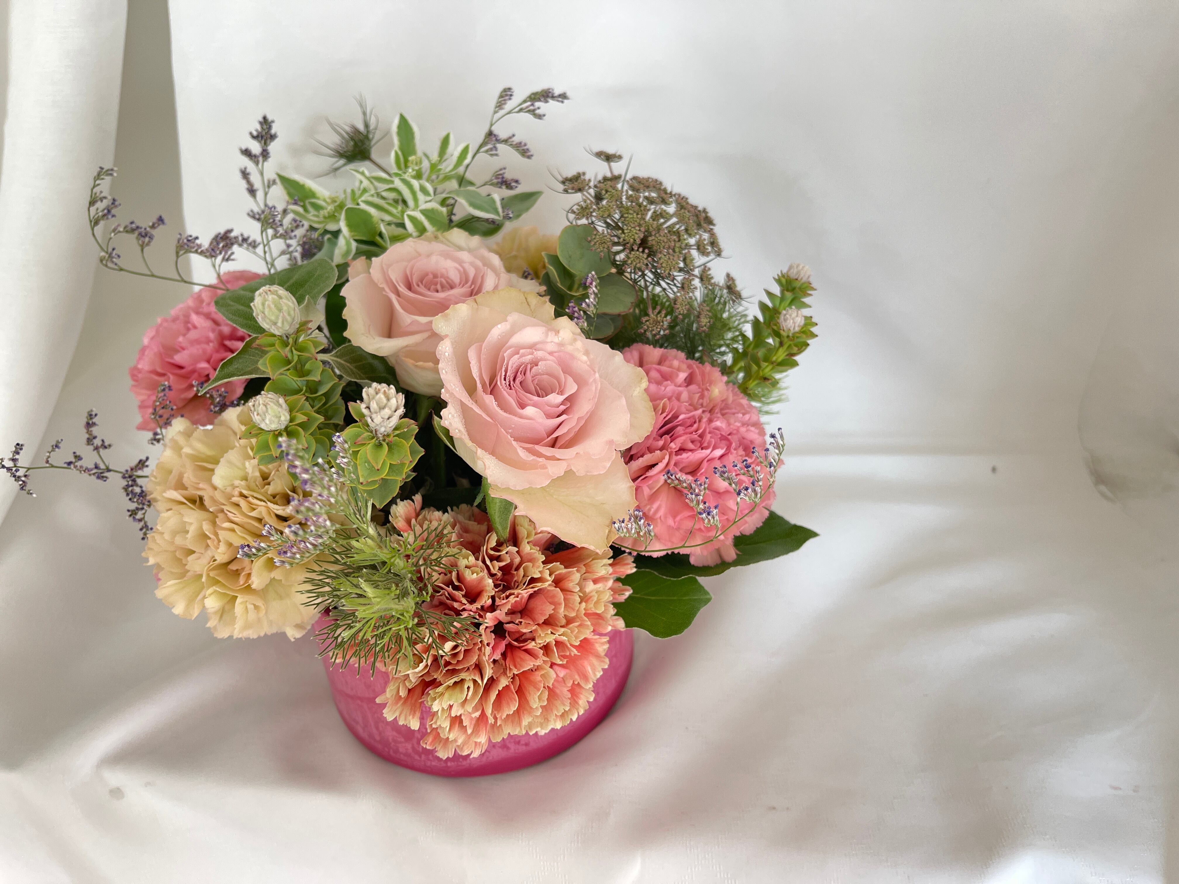 縁のカーネーションアレンジメントは、花材の鮮度と品質にこだわり、お母様に最高のお花をお届けします。